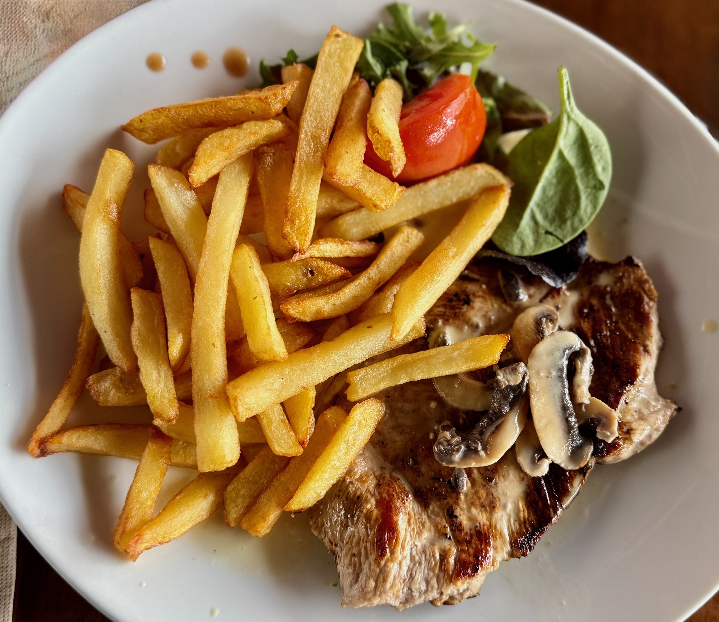 Hungrig kehrten wir schließlich zum alten Hafenbecken zurück, wo uns die Restaurant-Tafeln mit Bildern von Moules-frites und Crêpes anlachten. Klar, touristisch ist’s hier, und kulinarisch konnten wir das Essen nicht mit dem La Flottille in Étretat vergleichen. Aber: es nährt. Und das zählt, besonders nach einer Roger-konformen Marschroute.