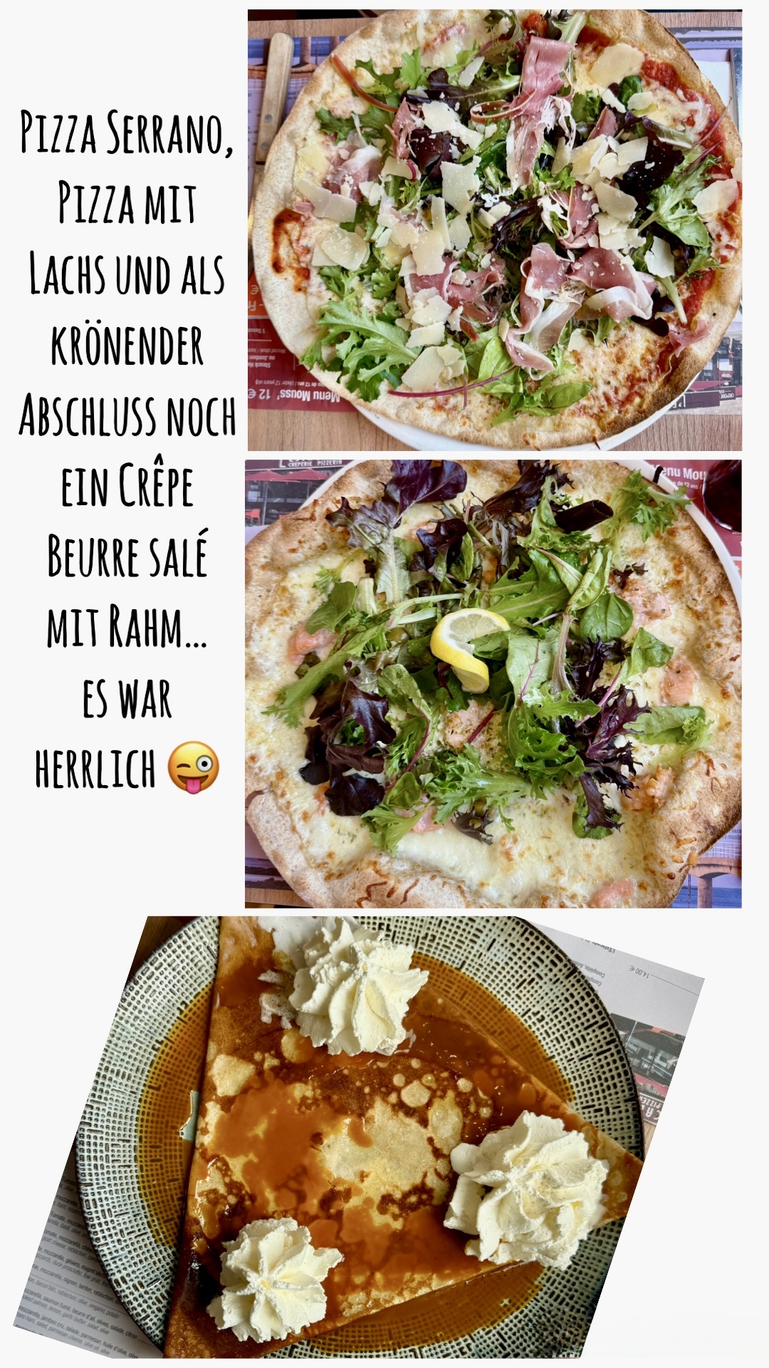 Und jetzt wird’s ernst: ich dränge auf Essen, Roger runzelt die Stirn (soviel Regen, so nass, nicht sein Ding). Regen hin oder her, wir satteln die Velos und radeln los (Claudia hat sich durchgesetzt :-)...). Total durchnässt erreichen wir den alten Hafen von Roscoff. Erstes Restaurant? Voll bis auf den letzten Krümel. Zweites Restaurant? Jackpot: ein freier Platz in einer Pizzeria. Pizza bestellt, verschlungen, und weil wir schon so schön dabei sind, noch einen Crêpe mit beurre salé caramel und Schlagrahm oben drauf. Himmlisch! Während wir kauen, trocknen auch unsere Klamotten – nur die Füsse bleiben beleidigt in ihren nassen Schuhen.