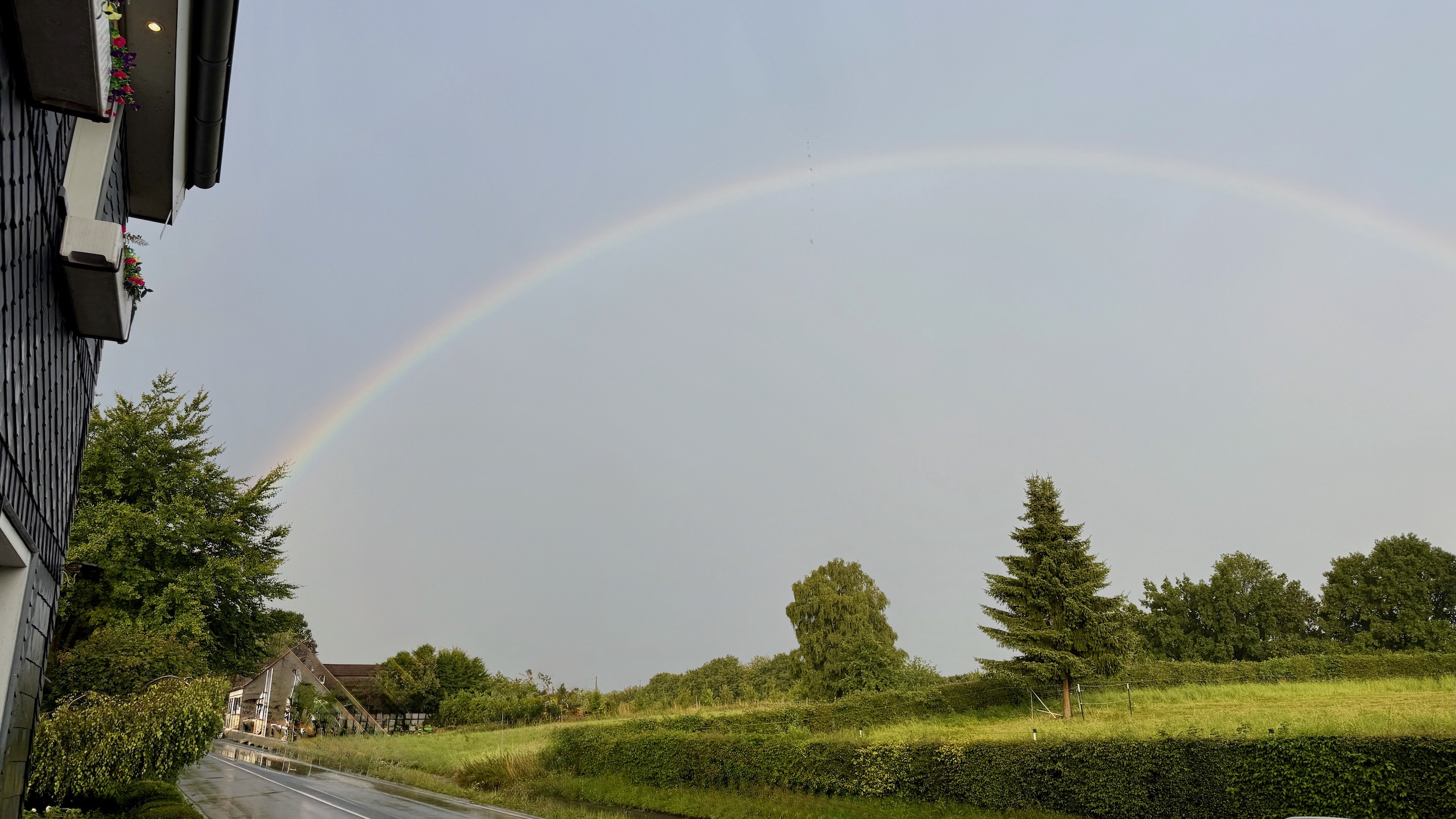 Als wir schließlich nach dem Essen das Gasthaus verliessen, bot sich uns ein besonderer Anblick: Ein strahlender Regenbogen war zu sehen. Für einen Moment blieben wir stehen, bewunderten das Farbenspiel am Himmel und machten sogar ein paar Fotos, bevor wir mit vollen Bäuchen den Heimweg antraten. So endete unser Tag nicht nur pappsatt, sondern auch müde und zufrieden.