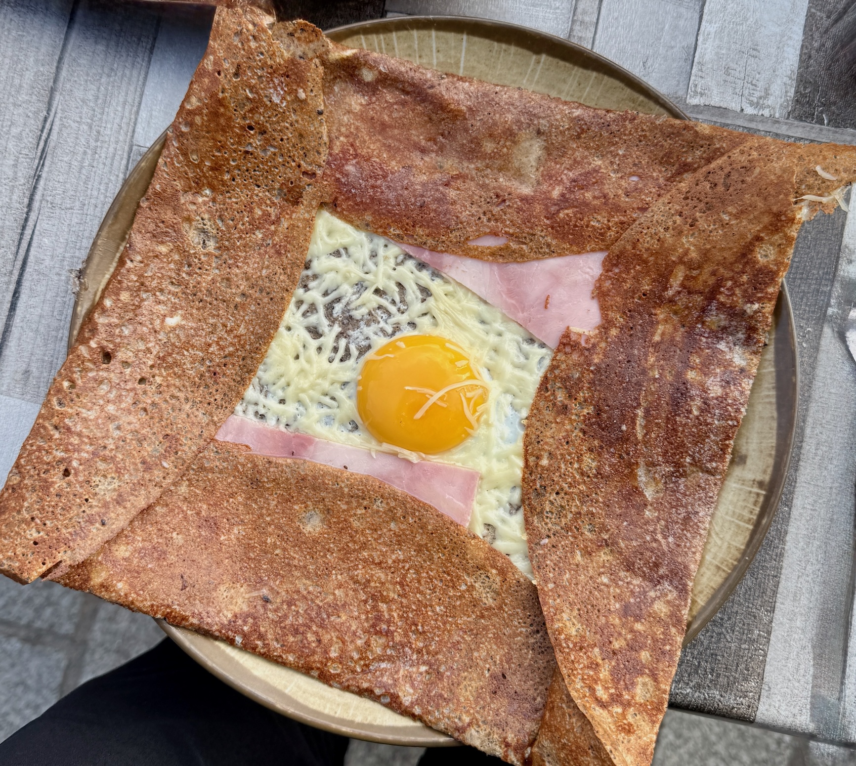 Strandbesichtigung? Klar, aber wie gewohnt: Ebbe. Zurück zur Crêperie, diesmal mit einer ehrlichen Galette im Bauch – Schinken, Käse, Ei. Wir nannten es „Zvieri“. Unser Magen allerdings nannte es: „All you can eat“. Um 18.30 Uhr stand fest: Nachtessen gestrichen, wir sind voll bis obenhin.