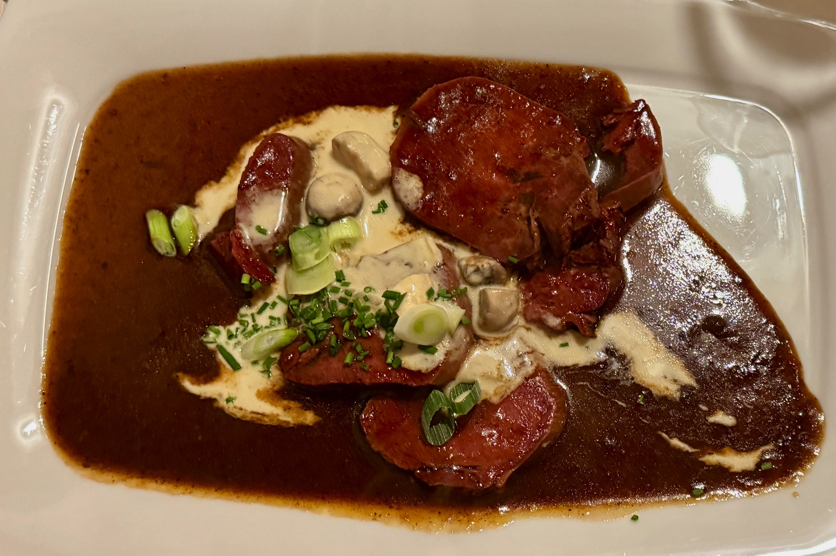 Drinnen war’s warm und das Essen fein – nur das Fleisch etwas schüchtern portioniert (ich Hirschragout mit Knödel, Roger Rindszunge mit Spätzle). Dafür war der Geräuschpegel umso lauter. Nach dem „Ochsen" machten wir uns also tapfer auf den 1,2 km langen Rückmarsch durch die kalte Nacht...