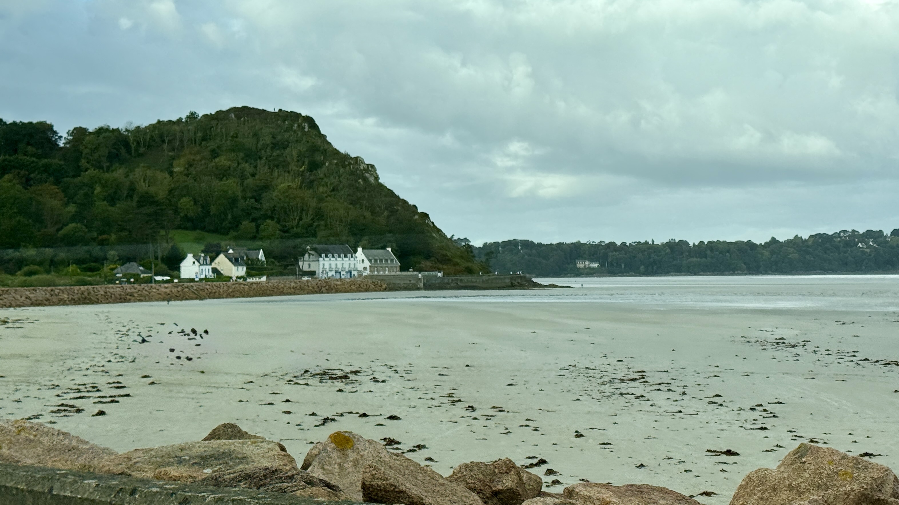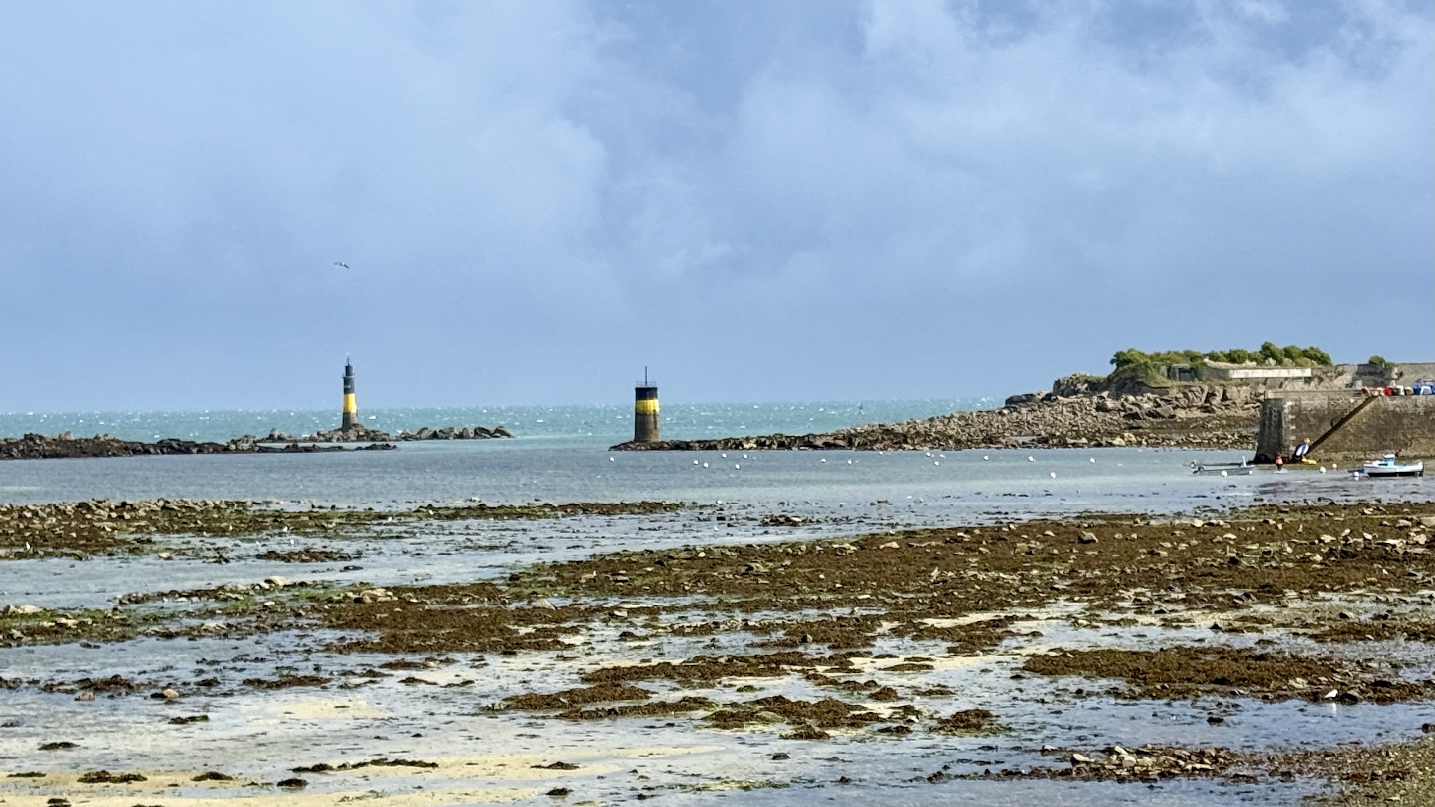 Dann die Überraschung: der Regen verzieht sich, die Sonne zeigt sich kurz. Am Hafenbecken entdecken wir Ebbe vom Feinsten – fast kein Wasser mehr! An der Nordküste der Bretagne können die Gezeiten nämlich Höhenunterschiede von bis zu 14 Metern haben. Ganze Buchten laufen einfach leer, und selbst 10–15 km im Landesinneren merkt man noch das ständige Auf und Ab. Der Atlantik schiebt da nämlich eine ordentliche Wasserwulst in den flacheren Ärmelkanal – und zack, steigt der Pegel wie beim Pepsi-Zero-Glasnachfüllen.